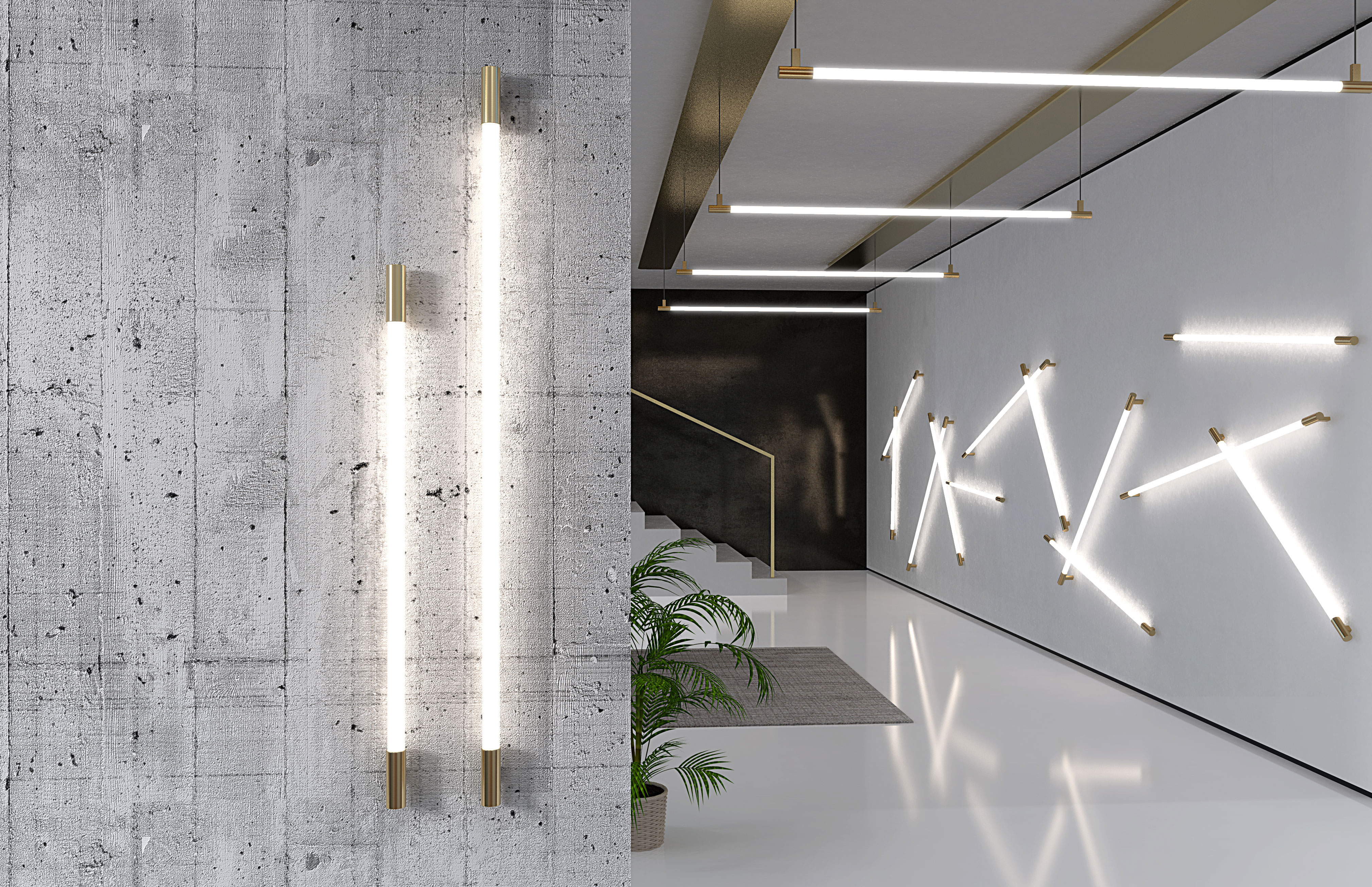 Die schlanke Lichtlinie, die an beiden Enden in mattierte Messinghalterungen übergeht, verzaubert durch ihre edle