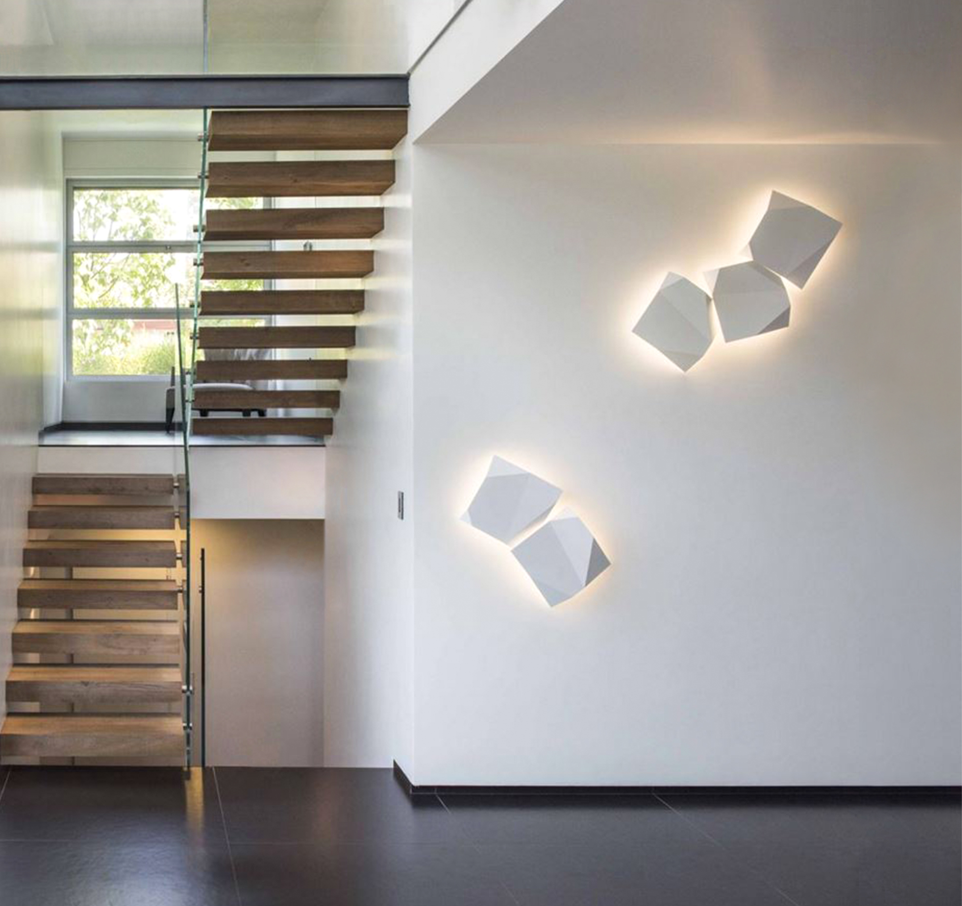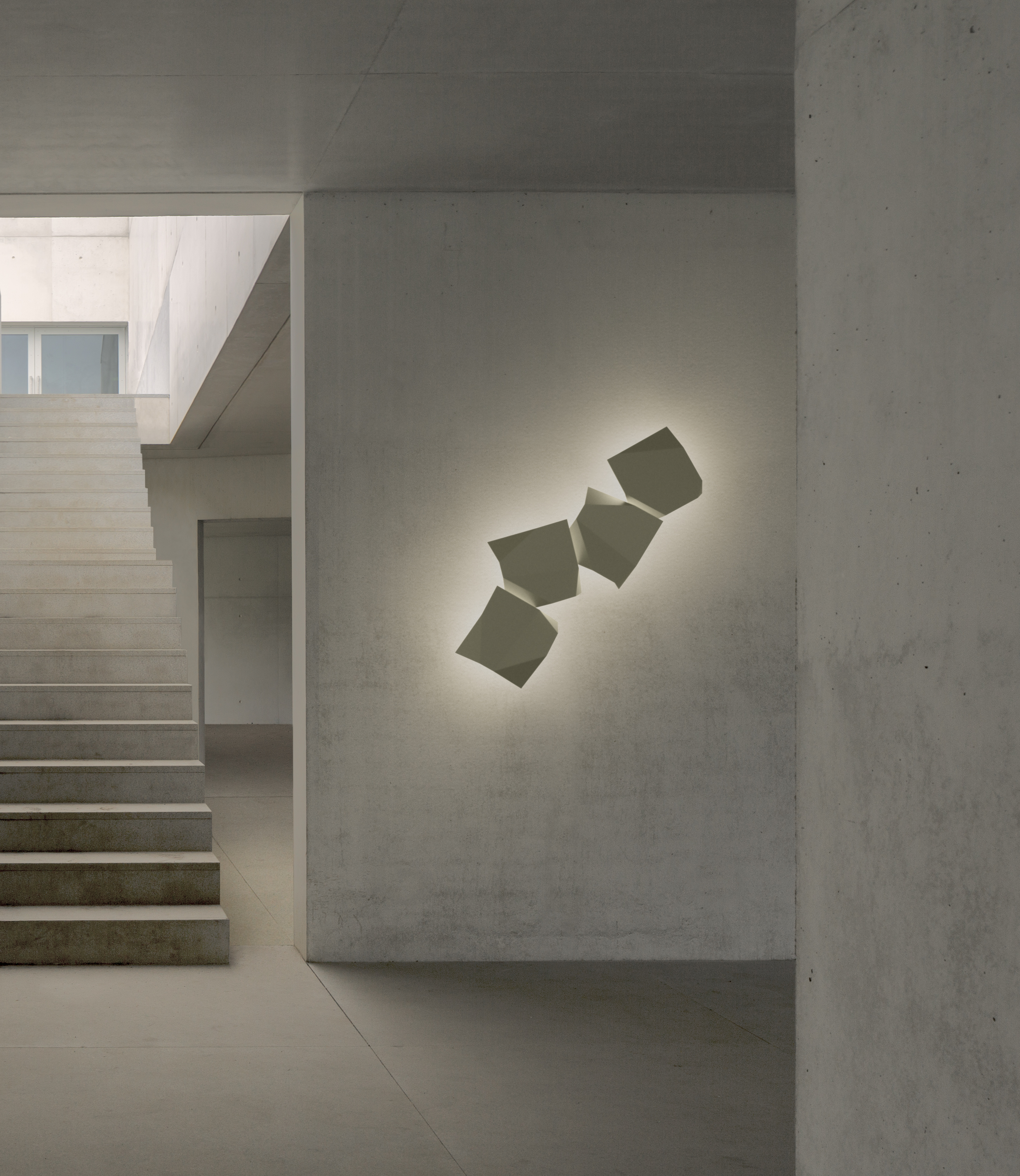 Die Kollektion der Wandleuchte Origami nutzt LEDs als dimmbare Lichtquelle, benötigt lediglich einen einzigen elektrischen Anschlusspunkt und wird auf der Oberfläche (als Aufbauleuchte) installiert.