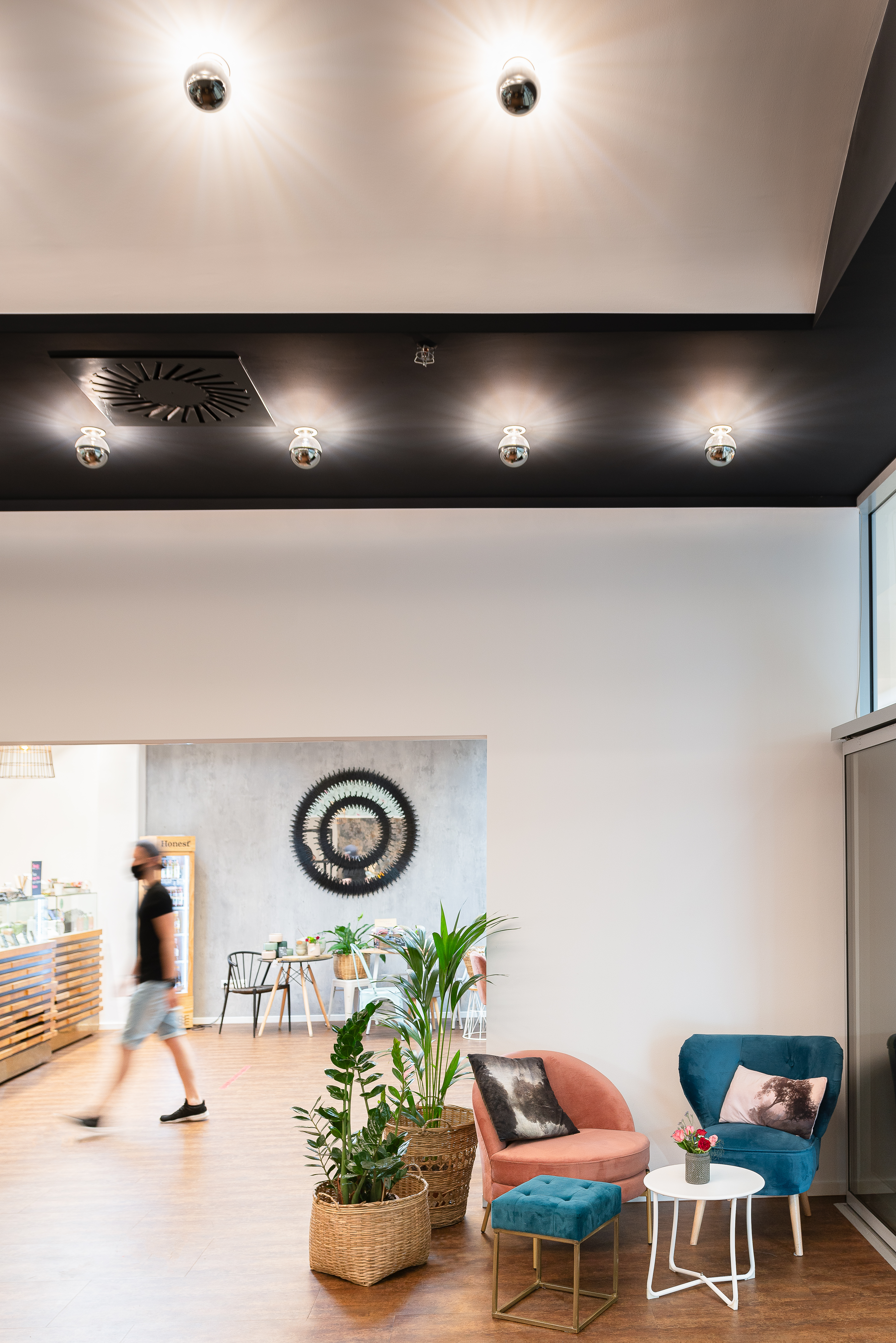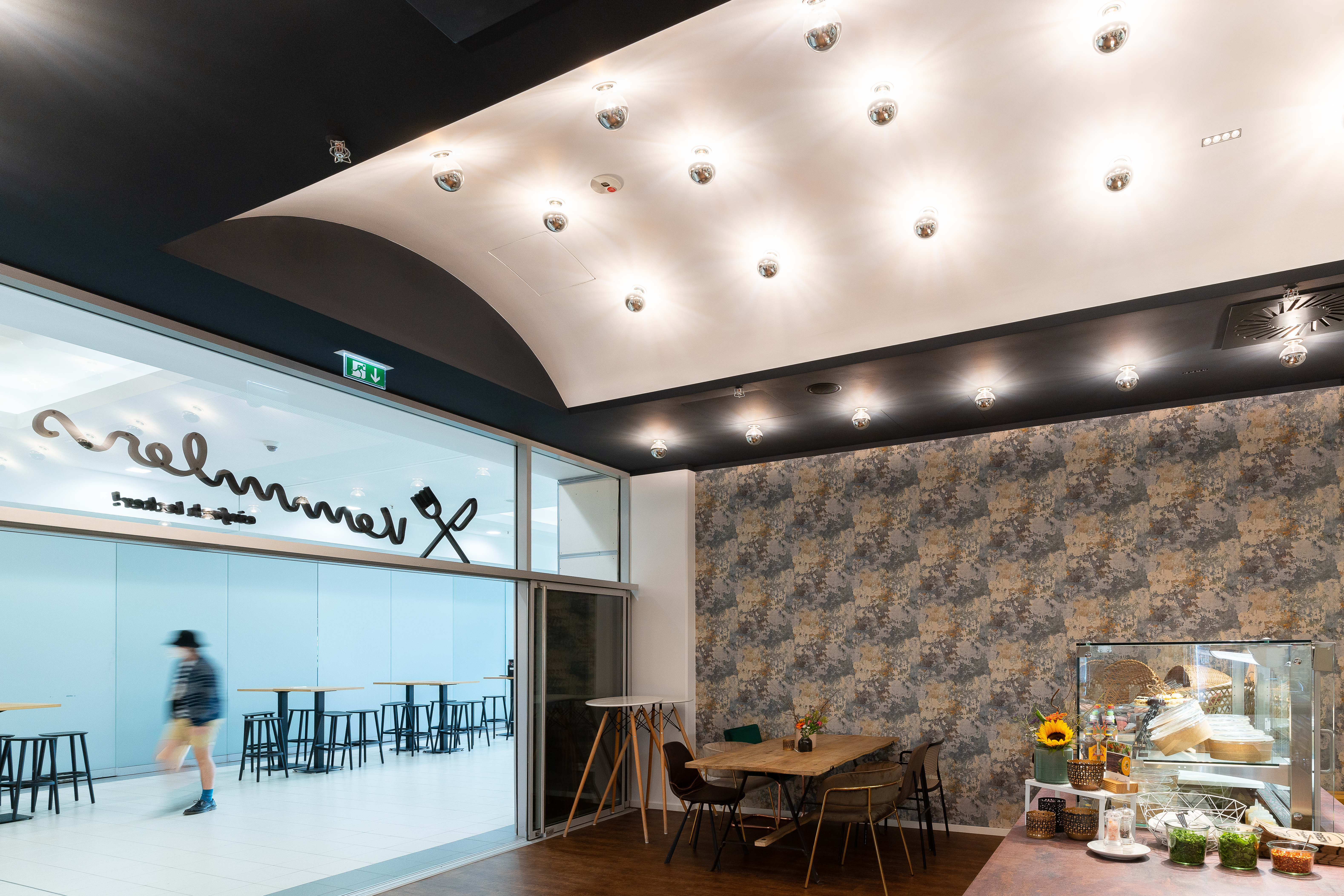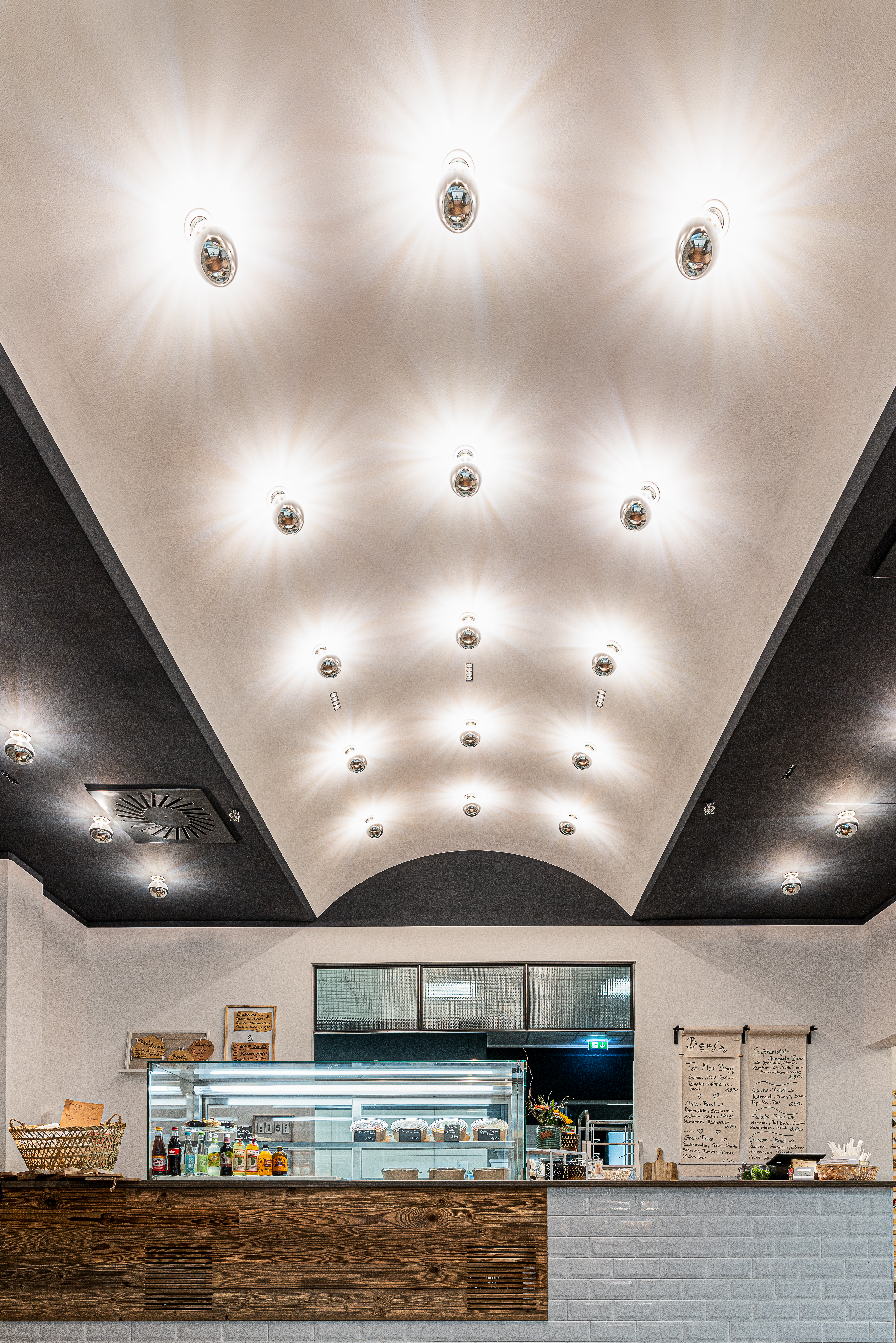 Von der Planung über die Visualisierung bis hin zur Ausführung in allen Gewerken, konnte durch die Installation der Spiegelkopfleuchten mit dem farblichen Kontrast zur Wölbung eine außergewöhnliche Deckenkonstruktion geschaffen werden.
