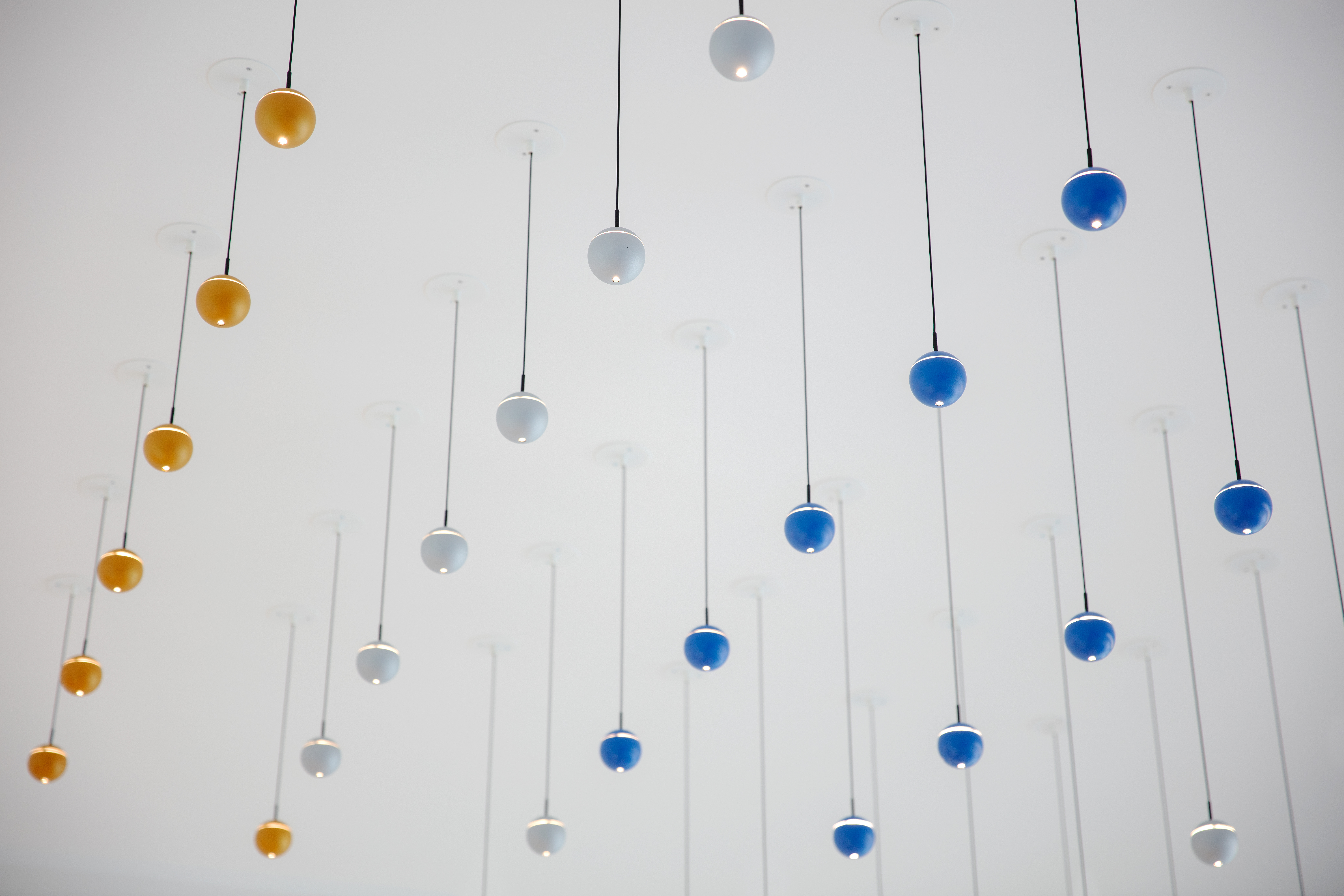 Das Foyer des Nachbargebäudes der Davies GmbH in der Leopoldstr. 254 in München wurde mit 60 Stück der „Snooker Shine“ Pendelleuchten der Firma Prolicht ausgestattet.